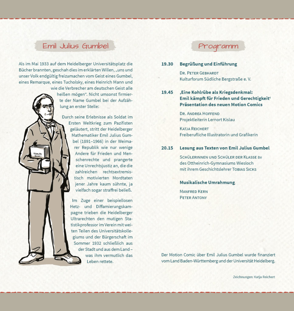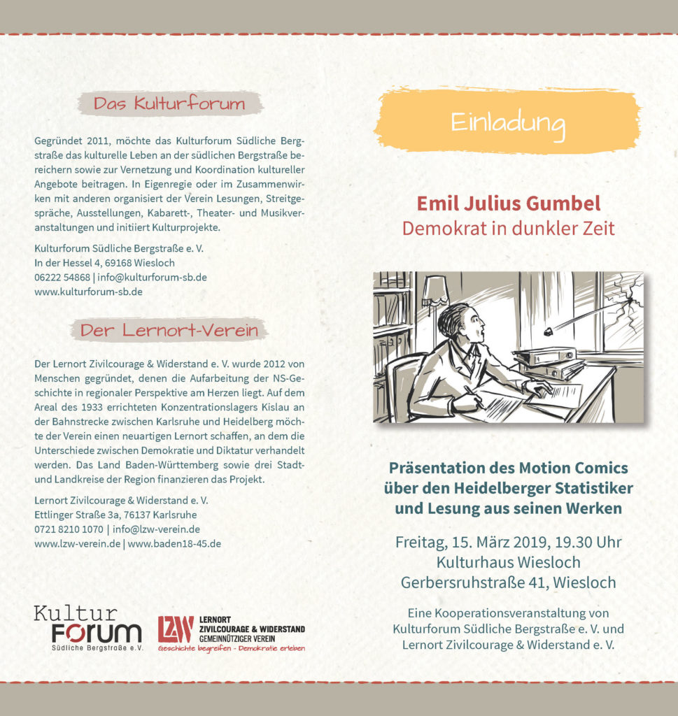 Emil Julius Gumbel Demokrat in dunkler Zeit Kalender Zum Kalender hinzufügen Zum Timely-Kalender hinzufügen Zu Google hinzufügen Zu Outlook hinzufügen Zum Apple-Kalender hinzufügen Zu anderem Kalender hinzufügen Export to XML Wann: 15. März 2019 um 19:30 – 21:00 2019-03-15T19:30:00+01:00 2019-03-15T21:00:00+01:00 Wo: Kulturhaus Wiesloch Gerbersruhstraße 41 69168 Wiesloch Deutschland